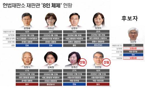 과거 법원 재직시 활동과 그동안의 헌재 결정을 봤을 때 문형배 이미선 정계선 재판관은 진보 성향, 정형식 조한창 재판관은 보수 성향으로 분류되며 김형두 재판관은 중도 성향으로 평가합니다. 정정미 재판관은 중도 진보, 김복형 재판관은 중도 보수 쪽에 가깝다는 평가입니다.